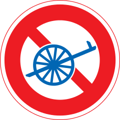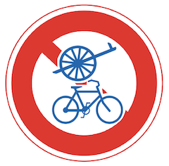 This might at first seem as if it prohibits “bicycles and hand carts”, but on road signage, the hand-cart symbol officially signifies “non-motorized vehicles except bicycles”, so the above sign really means “no bicycles and no non-motorized vehicles except bicycles”.