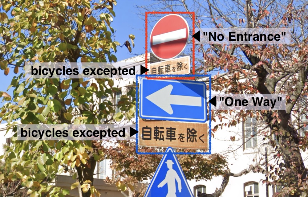 Japanese roads often have different rules between bicycles and cars, such as a bicycle being allowed to go against traffic on many one-way roads, or a bicycle being prohibited from certain road sections. However, the related traffic signage can be confusing even for Japanese natives.